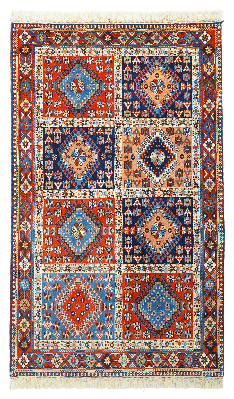 | 商 品 名 | 手織りペルシャ絨毯 ヤラメ、ウール、153x109cm、赤茶×濃紺 |