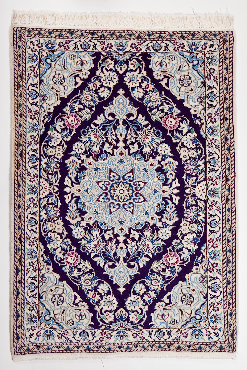 | 商 品 名 | 手織りペルシャ絨毯 ナイン、ウール(一部シルクを使用)、85x60cm、玄関マットサイズ |