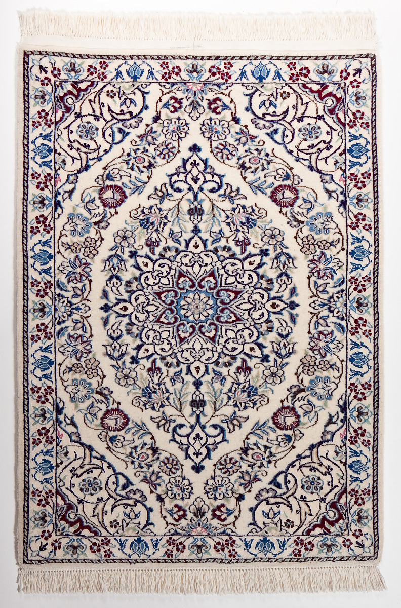 商 品 名 | 手織りペルシャ絨毯 ナイン、ウール(一部シルクを使用)、77x54cm、玄関マットサイズ |