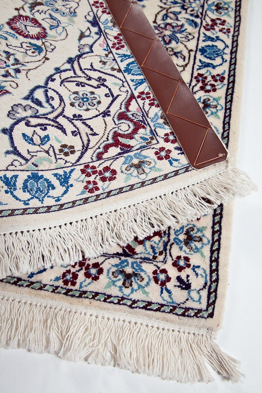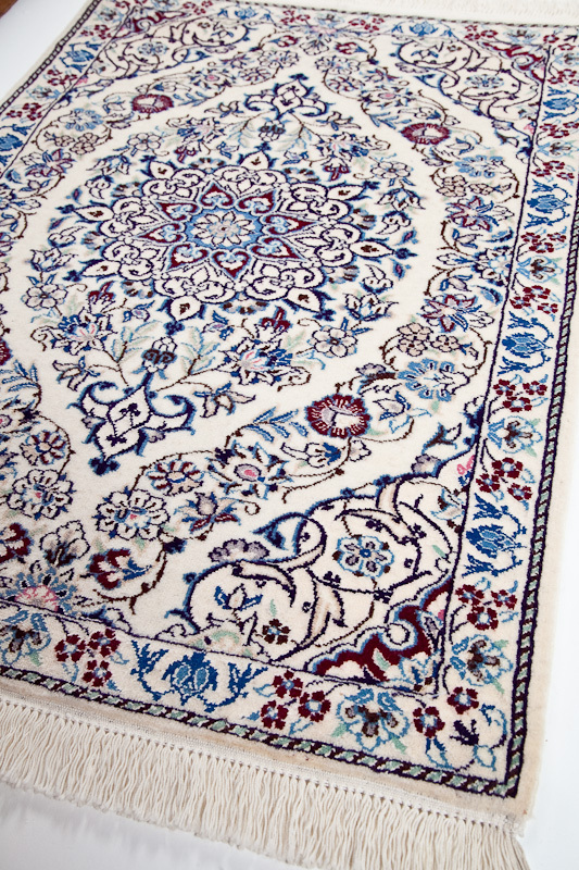 | 商 品 名 | 手織りペルシャ絨毯 ナイン、ウール(一部シルクを使用)、77x54cm、玄関マットサイズ |