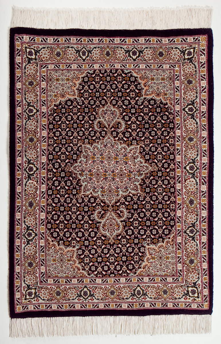 商 品 名 | 手織りペルシャ絨毯 タブリーズ、リーズ・マヒ柄、ウール(一部シルクを使用)、95x65cm、玄関マットサイズ |